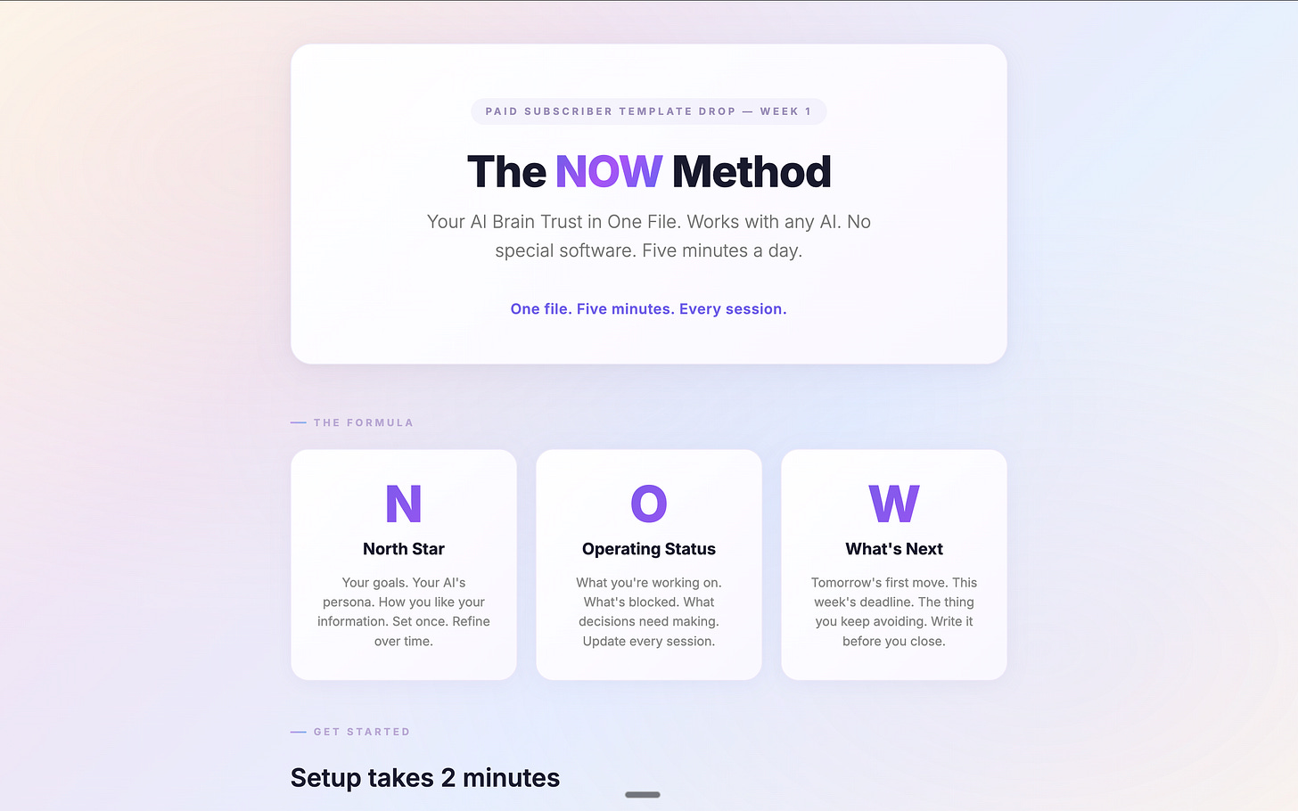 Stage 1: The NOW Method (your AI brain trust file) ← this week Stage 2: The Content Atomization Table Stage 3: The Training Capture Card Stage 4: The Morning Standup Protocol Stage 5: The Advancer (editorial intelligence) Stage 6: The Signal Room (real time intelligence) Stage 7: The Audience Architecture Map Stage 8: The NotebookLM Studio (content multiplication) Stage 9: The Gap Scanner (finding what nobody’s covering) Stage 10: The Launch Sequence (coordinated multi platform drops)