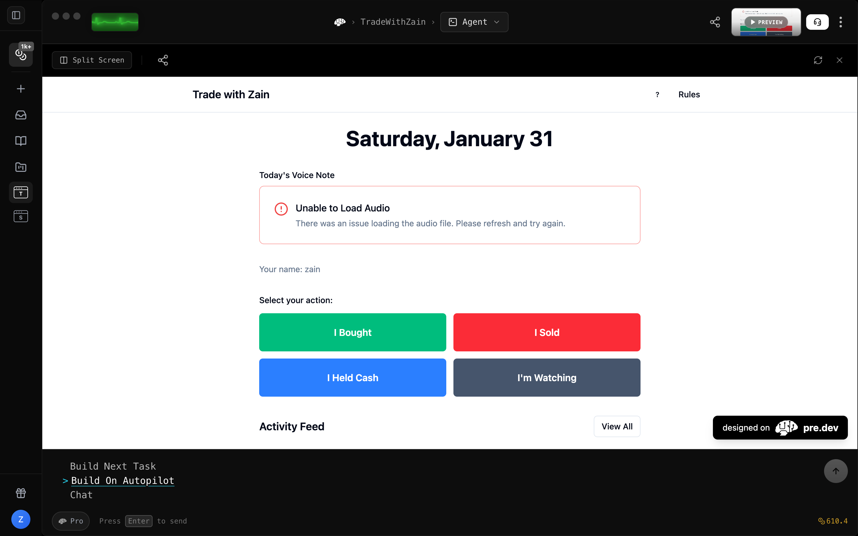 I tested the same PRD out on Lovable, Bolt, and Claude Code for speed. Claude Code was the best because it immediately build an easy way to record for me with no drama. The other two had a great design but were not able to easily handle the voice note concept and upload. I immediately was able to talk about the PLTR buy signal yesterday when the markets fell, what I did and uploaded the quick voice note.